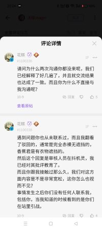 收到回复后兄贵民愤怒不已,前管理员 斯哈卡(UID3603),网站用户清清晨晨(UID6507),不人气的早苗(UID74560),KAMINO_KAIUMO(UID57767)在无关评论区发电引战,发布无意义评论,又发布与该事件有关的引战动态。搬运工kochiya-sanae(UID3595)删除所有稿件并发布退站声明,其余兄贵作者也发动态表示不满。此事令花糕愤怒不已,于10月7日上午封禁了部分人的账号,并在封号前于评论区发疯,随后立刻清除动态。另外,审核也将所有兄贵的动态删除捂嘴,并在动态里大谈“言论自由”。(图为兄贵民发动态表达不满,现已被全部删除)